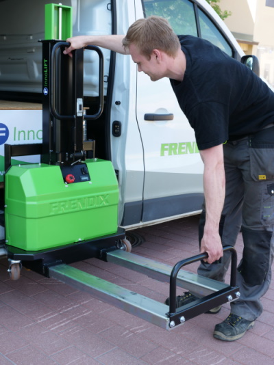Finnische InnovationDer InnoLIFT verlädt Paletten und sich gleich mit. Dabei ist der Platzbedarf im Fahrzeug der gleiche wie bei einem herkömmlichen Handhubwagen.Durch sein geringes Eigengewicht und die große Hubkraft von bis zu 1 Tonne ist der Innolift einer Hebebühne im leichten Nutzfahrzeugsegment klar überlegen. Dazu ist noch fahrzeugungebunden einsetzbar.